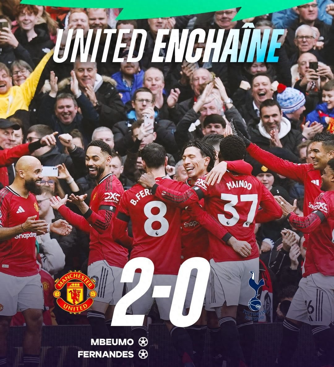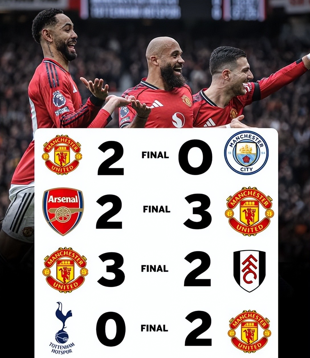 曼联完成了4连胜--从主场2-0曼城到客场3-2阿森纳从而双杀联赛前两名,再到主场3-2绝杀富勒姆以及2-0完胜热刺豪取联赛4连胜。