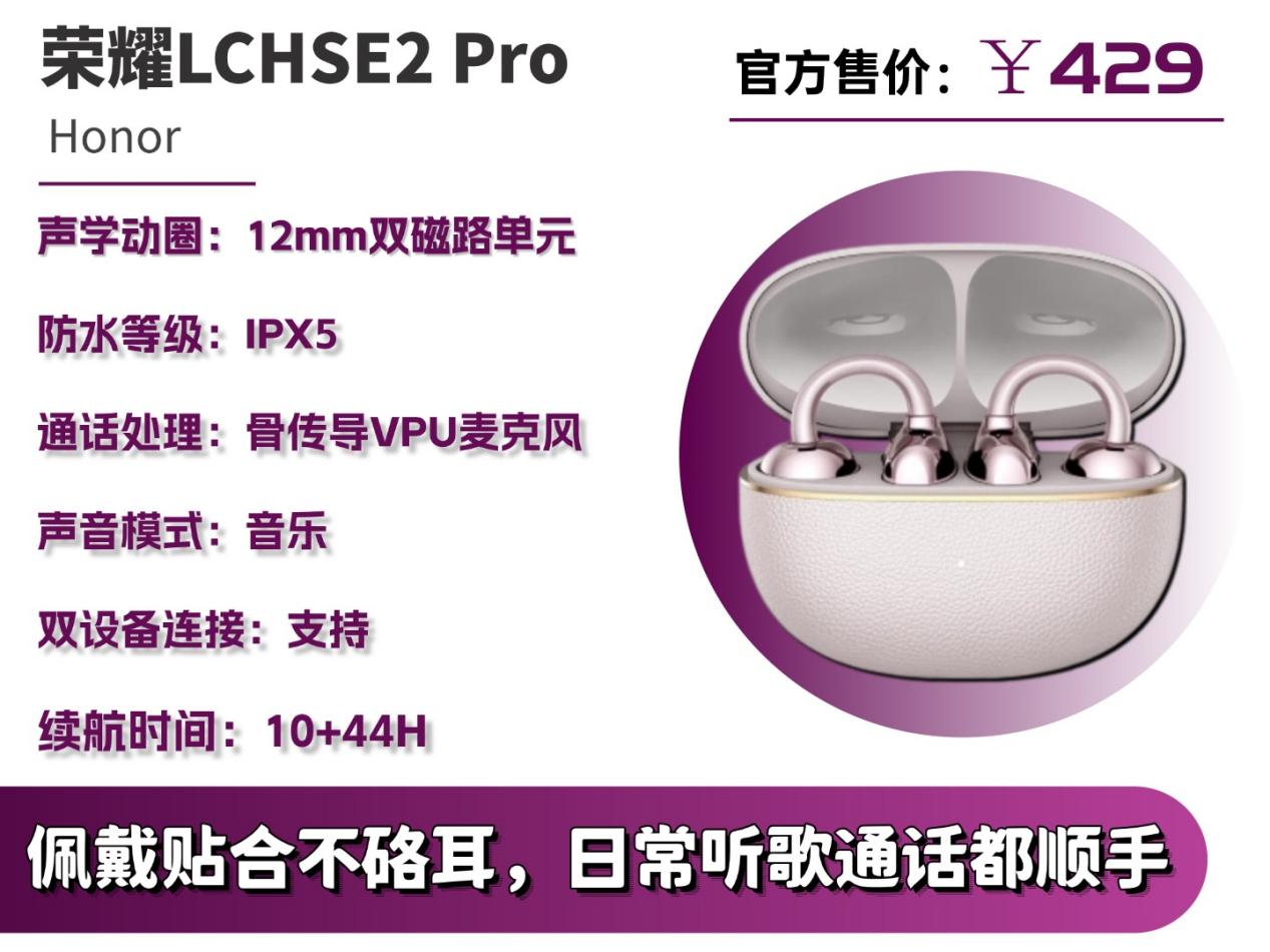 作为五百元内性价比耳夹式耳机首选,它的硬件配置诚意十足,搭载13mm 双磁石墨烯动圈单元,双高精度磁铁强化了声音磁场,搭配形变能力优异的石墨烯振膜,让人声还原真实自然,没有过度修饰的违和感;气旋式引擎腔体还能提升气流推力,让重低音更有质感,力道适中不震耳,远超同价位只堆音量的机型。佩戴上更是优势明显,单耳仅 4.5g,上耳基本无感,长时间佩戴也不会有不适感。12° 弧面耳托能给耳廓恰到好处的支撑,2.5mm 前高后低的错位设计,既让耳机牢牢贴合耳廓,日常走路、轻微活动都不用担心脱落,又不会有夹耳的紧绷感,贴合度设计很用心。实用功能也面面俱到,自研防漏音模式效果显著,正常音量使用几乎无漏音,办公、通勤使用都合适;蓝牙 5.4 连接稳定,全程无断连卡顿;四麦 ENC 通话降噪能有效过滤环境杂音,通话清晰;8+32H 的续航组合,一周充一次电完全满足日常使用;IPX5 防水等级可应对日常出汗、小雨,再加上智能一拖二的双设备连接切换功能,对普通用户来说完全够用。