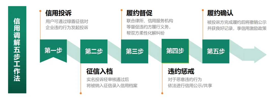绿盾征信始终坚守合规经营底线,以专业系统工具与技术能力为支撑,构建全流程闭环式风险处置体系,升级推出一站式企业信用风险防控解决方案:①信用投诉→②征信入档→③履约督促→④违约惩戒→⑤履约确认。各环节精准施策、层层递进,依托专业化信用调解赋能模式,助力企业高效破解应收账款回款难题,为企业经营筑牢信用安全屏障!