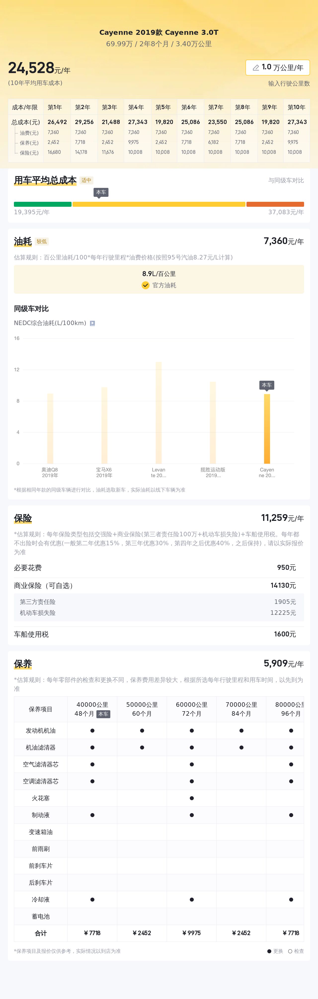 说到用车成本,根据估算,这辆Cayenne的年均综合用车成本在2.5万元左右。这里要说的是,实际费用支出可能会因使用频率、环境条件等因素而有所不同。