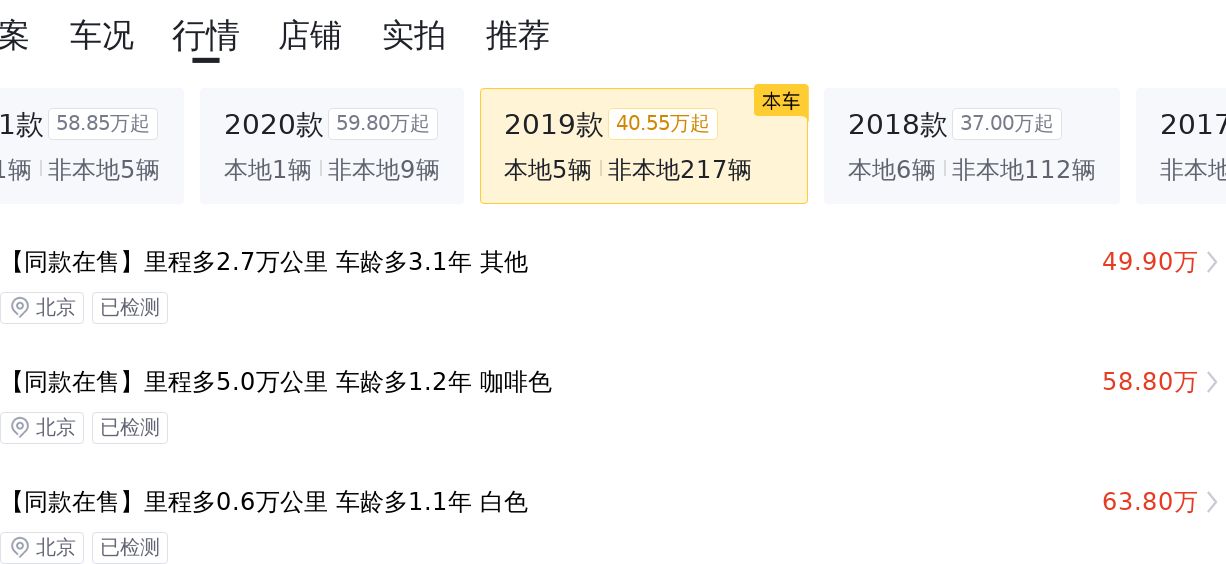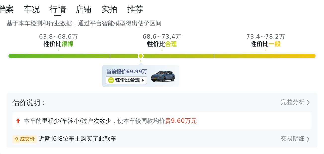 根据大数据预估显示,这辆车的市场价格在60.72万至72.88万之间。当然,市场价和成交价是两个概念,大家要知道这是会有差异的。拿这辆车来说,它的里程少于平均值,未过户,所以在价格上有一定的溢价空间。