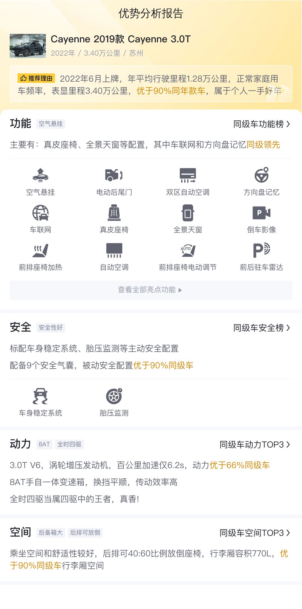 咱们现在要聊的这辆二手保时捷Cayenne,是2019款的Cayenne 3.0T,表上显示的里程数是3.4万公里。这车是在2022年6月在苏州上的牌照,车身和车牌照都在苏州,且至今未有过户记录,是保时捷Cayenne的入门车型。说到这辆车的价格,目前这款二手保时捷Cayenne的报价是69.99万,比新车含税价优惠29.64万。