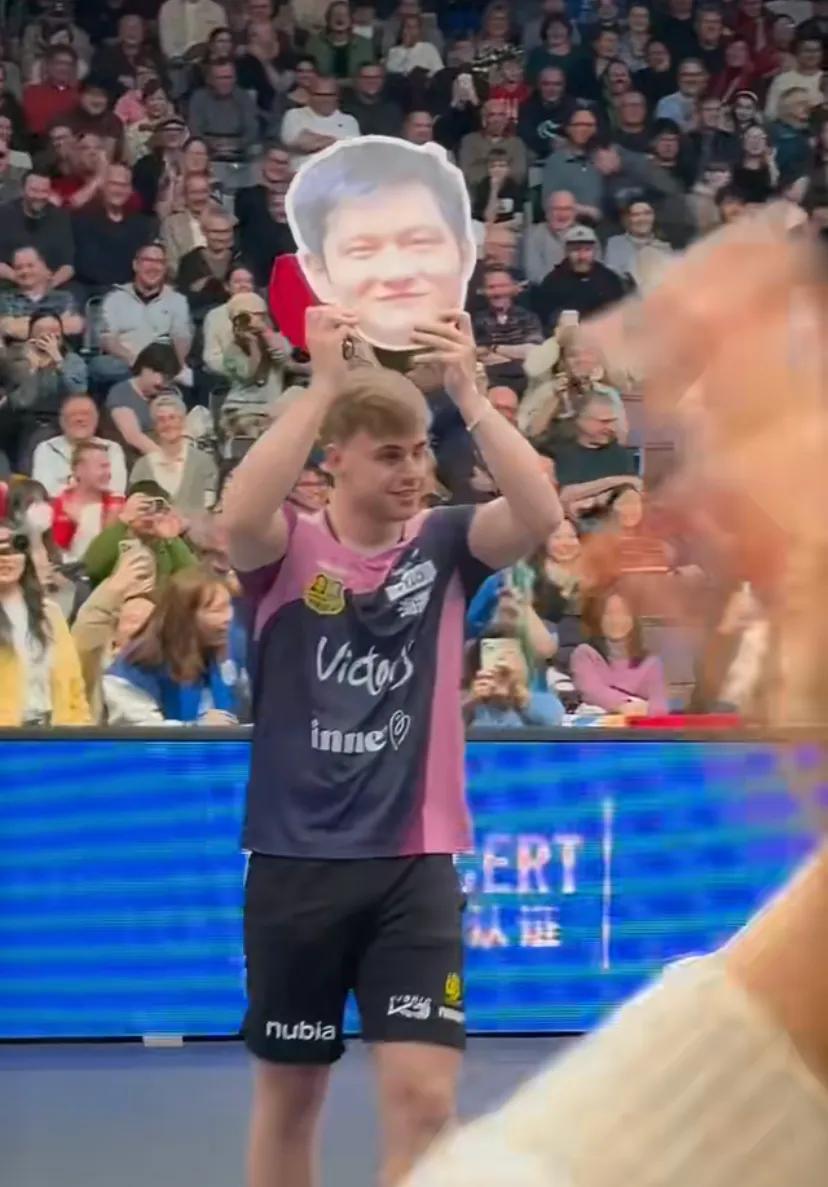 莫雷加德在赛场上拿出了樊振东头像,放在自己面前,之后高举起来,现场顿时热闹起来,球迷欢呼不断,樊振东也是十分意外。