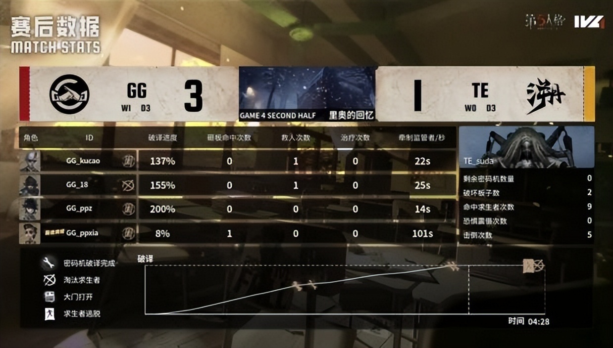 成都GG的求生者选择了机械师、“囚徒”、“骑士”、飞行家(BAN“跛脚羊”、渔女);TE的监管者ppei选择了时空之影。(BAN先知、空军、前锋、“逃脱大师”)