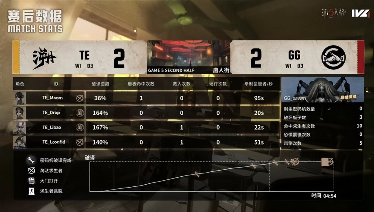 中期鹿头将入殓师击倒送椅,紧接着利用移形追击弓箭手,守墓人前来救下入殓师。随后鹿头将弓箭手击倒送椅,守墓人救下弓箭手并帮其扛伤后,密码机破译完毕。
