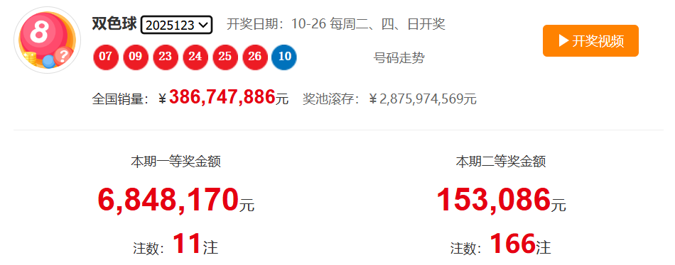 本期开奖号码为:红球:07、09、23、24、25、26 蓝球:10