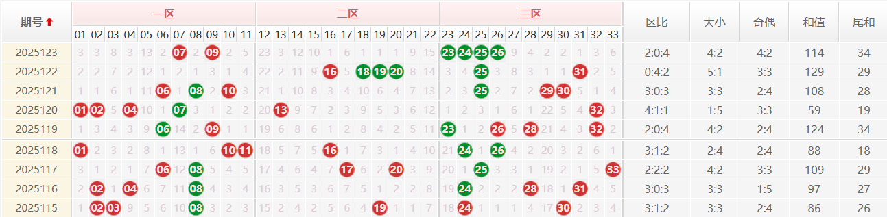 区间分布失衡: 本期红球主要集中在中后区(三区:23-33),一区(01-11)仅开出2枚,二区(12-22)则直接断区!这种极端的区间分布,往往是下一次号码向空白区域回补的强烈前兆。