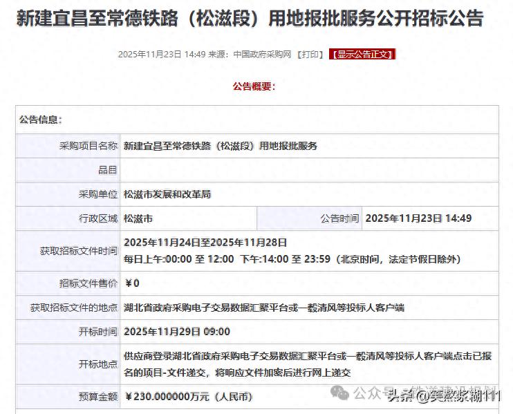 另讯:近日,新建宜昌至常德铁路宜昌段用地报批服务中标公告和松滋段用地报批服务公开招标公告相继发布,要求自合同签订之日起6个月内完成用地报批。