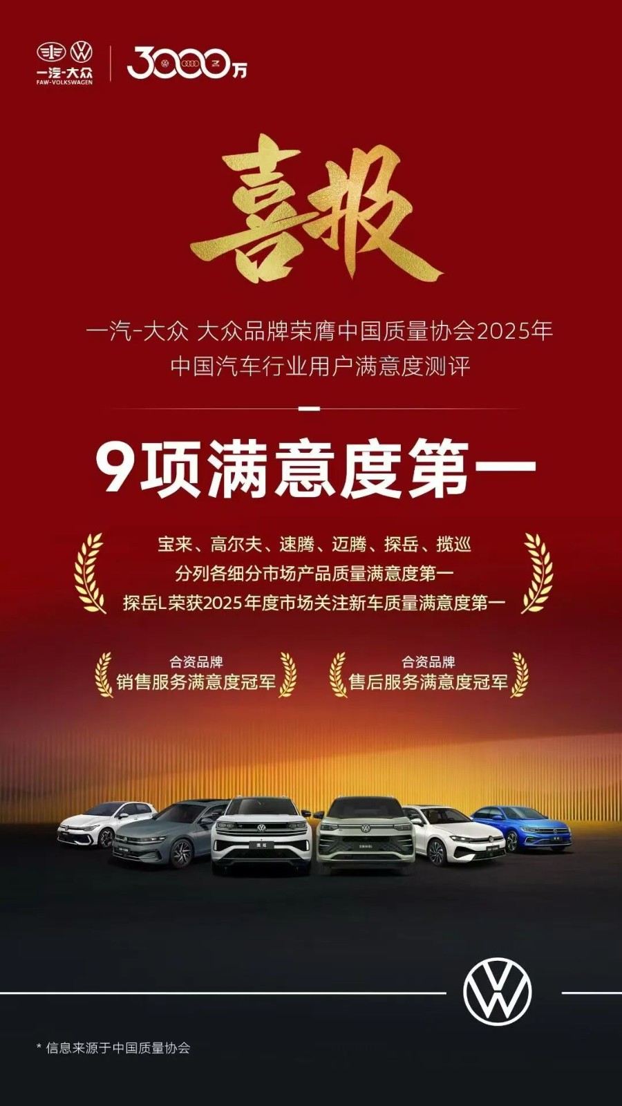 “开不坏的大众”口碑一汽-大众3000万辆的重要支撑,是超2000万客户对大众品牌的坚定选择。这份深厚的信赖,源于对品牌卓越品质与安全标准的长期认可,并在此次中国质量协会2025年CACSI测评中得到权威印证:一汽-大众大众品牌荣膺9项满意度第一,旗下宝来、高尔夫、速腾、迈腾、探岳、揽巡六款主力车型分获各细分市场产品质量满意度冠军,品牌更斩获合资品牌销售服务与售后服务满意度双料冠军。这充分验证了“开不坏的大众”不仅是用户间的美誉,更是经得起严格检验的市场事实。