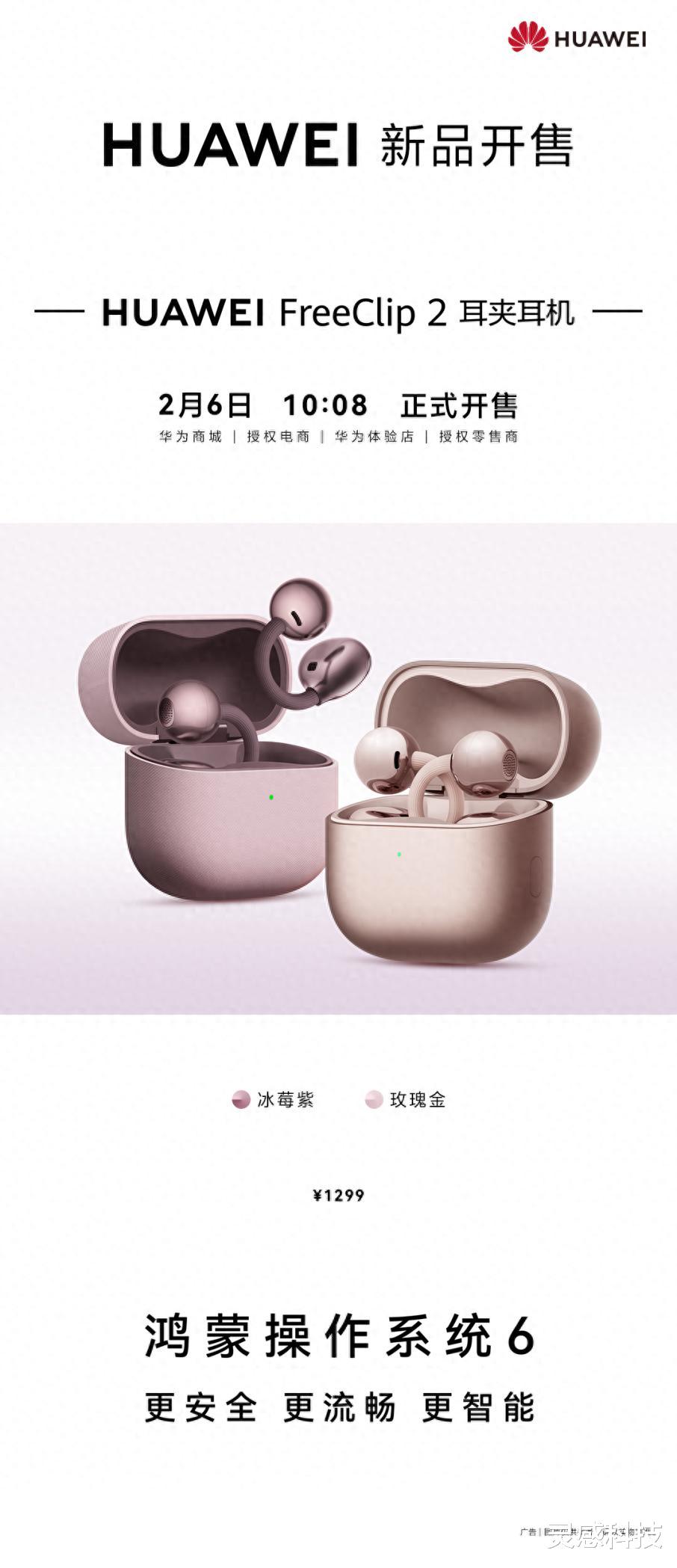 “现在耳机早已不只是单纯的听歌工具,更是作为电子配饰在日常穿搭中的加分项”,华为FreeClip系列用凭借独特设计和舒适体验获得不少用户青睐。2026年2月6日,华为FreeClip 2玫瑰金、冰莓紫两款新色正式开售,售价1299元。这款耳机携手周大福推出联名黄金配饰与礼盒,搭配星闪™音频技术的硬核加持,让科技产品既有颜值又实用,成为日常穿搭和生活场景的贴心之选。