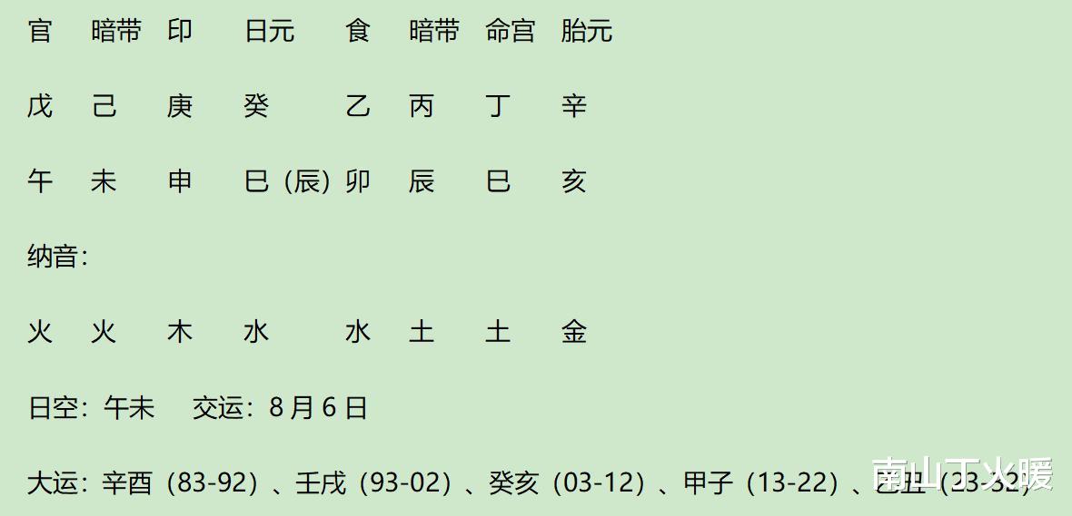 年透戊官,暗带透己杀,地支得1午1未2巳2辰、2纳音土助,纳音火生,戊官是3强根力量,己杀也是3强根力量,取七杀格。七杀得6强根力量,过强水平。