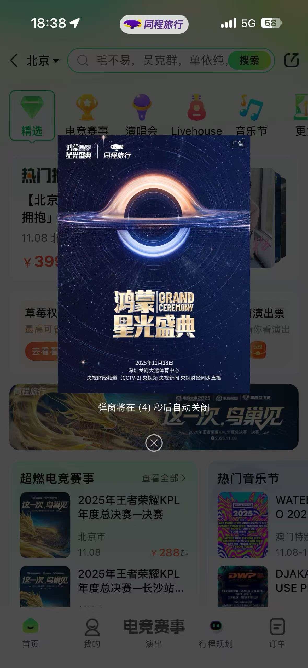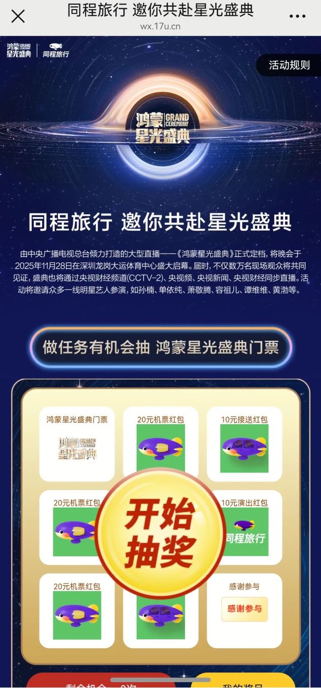 鸿蒙版同程旅行App首页也同步开启了抽门票活动,完成简单任务,就有机会赢取盛典门票。