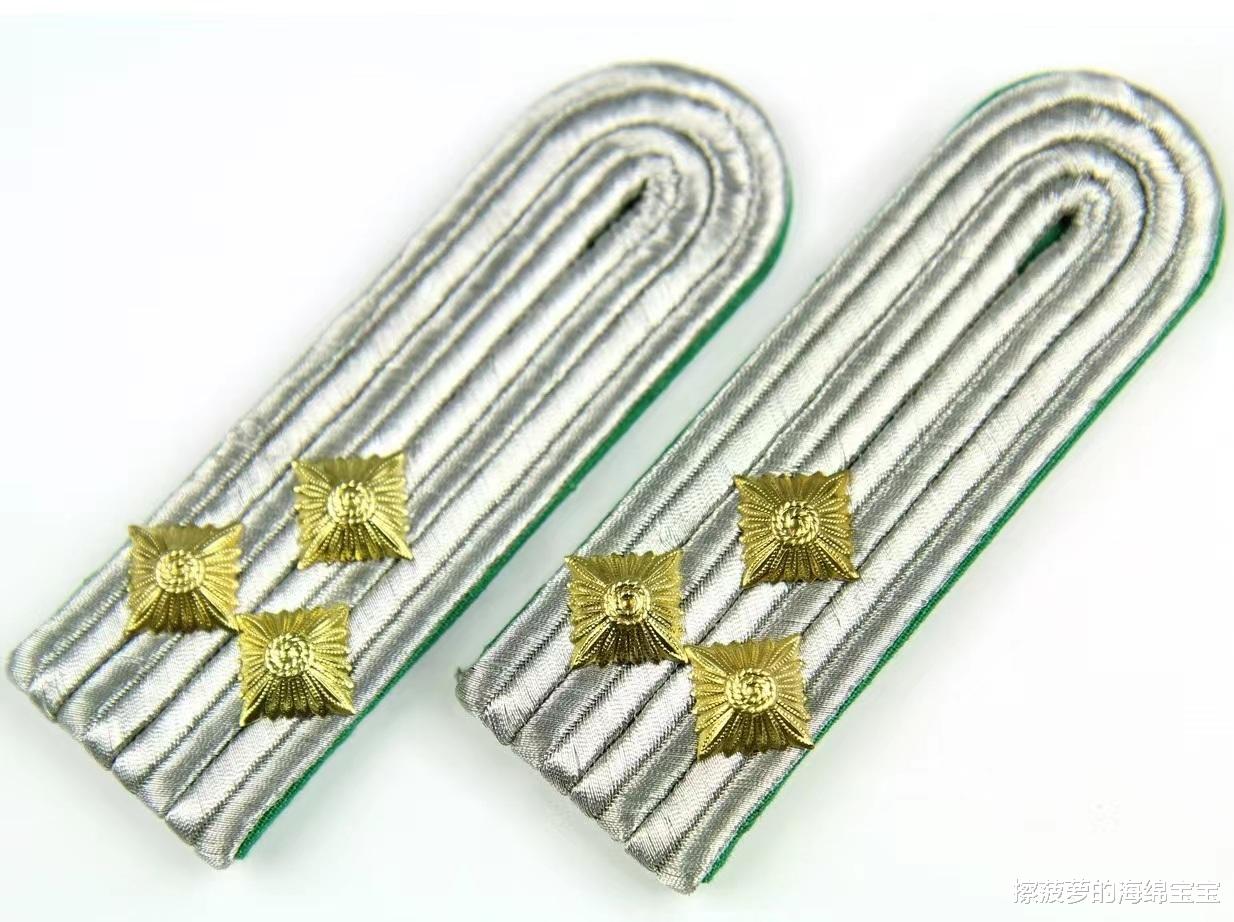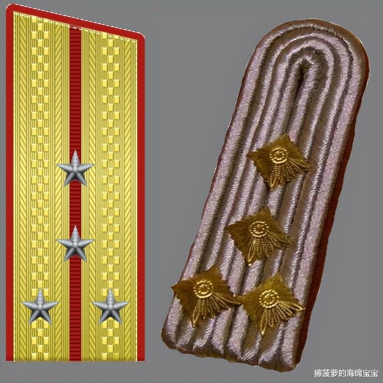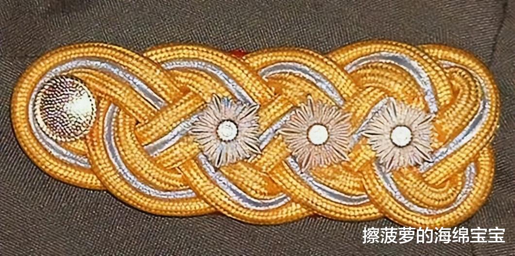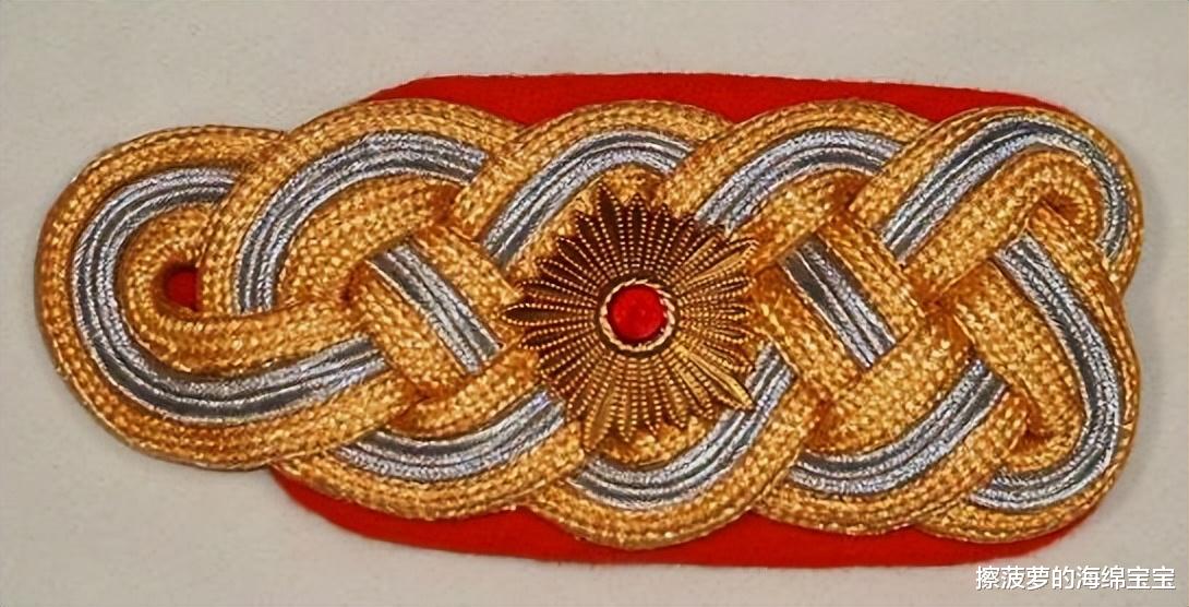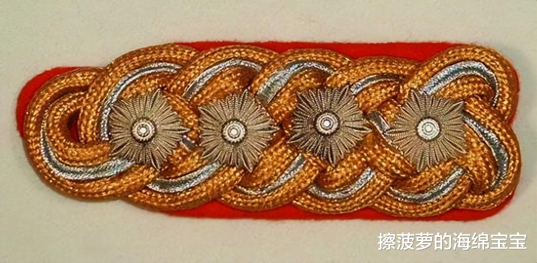 肩章为三根金银金丝线缠绕成麻花状,缀一颗军衔星,这个军衔星和之前军官的不一样,之前都是四边形的,将官的是五边形的。