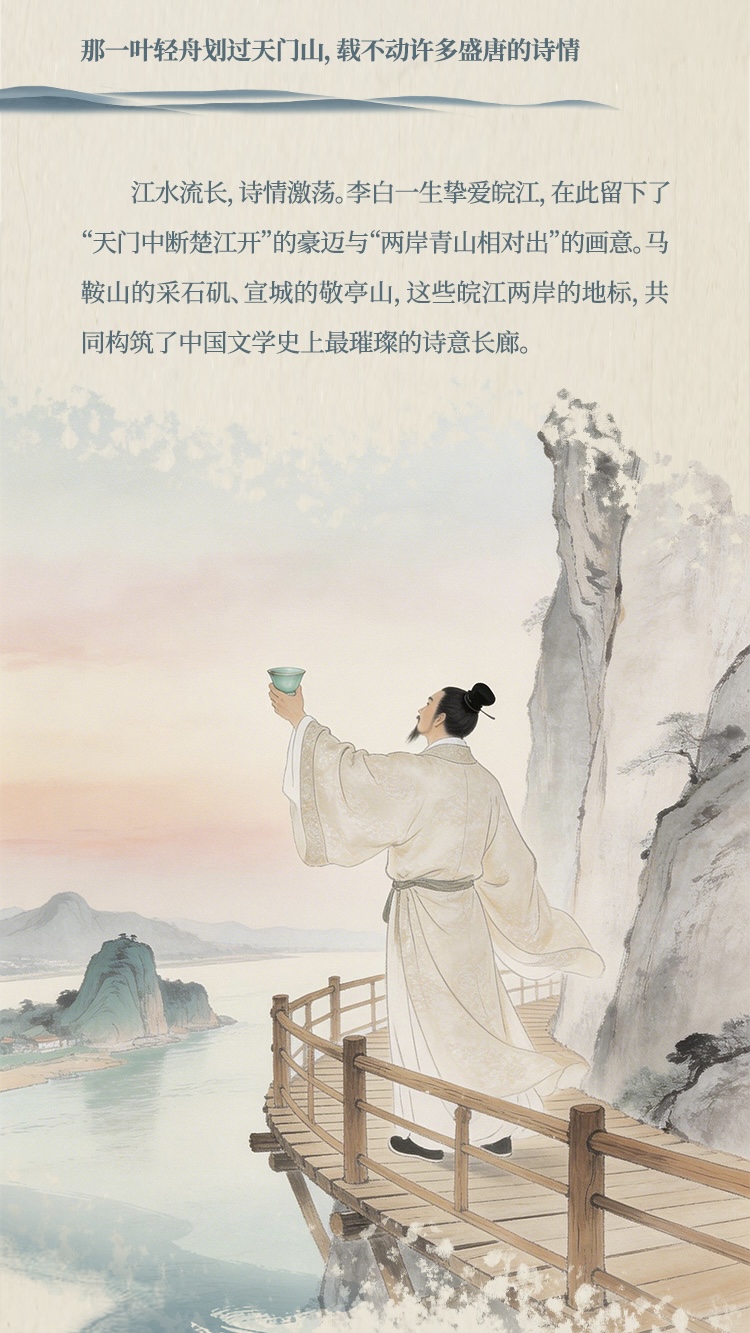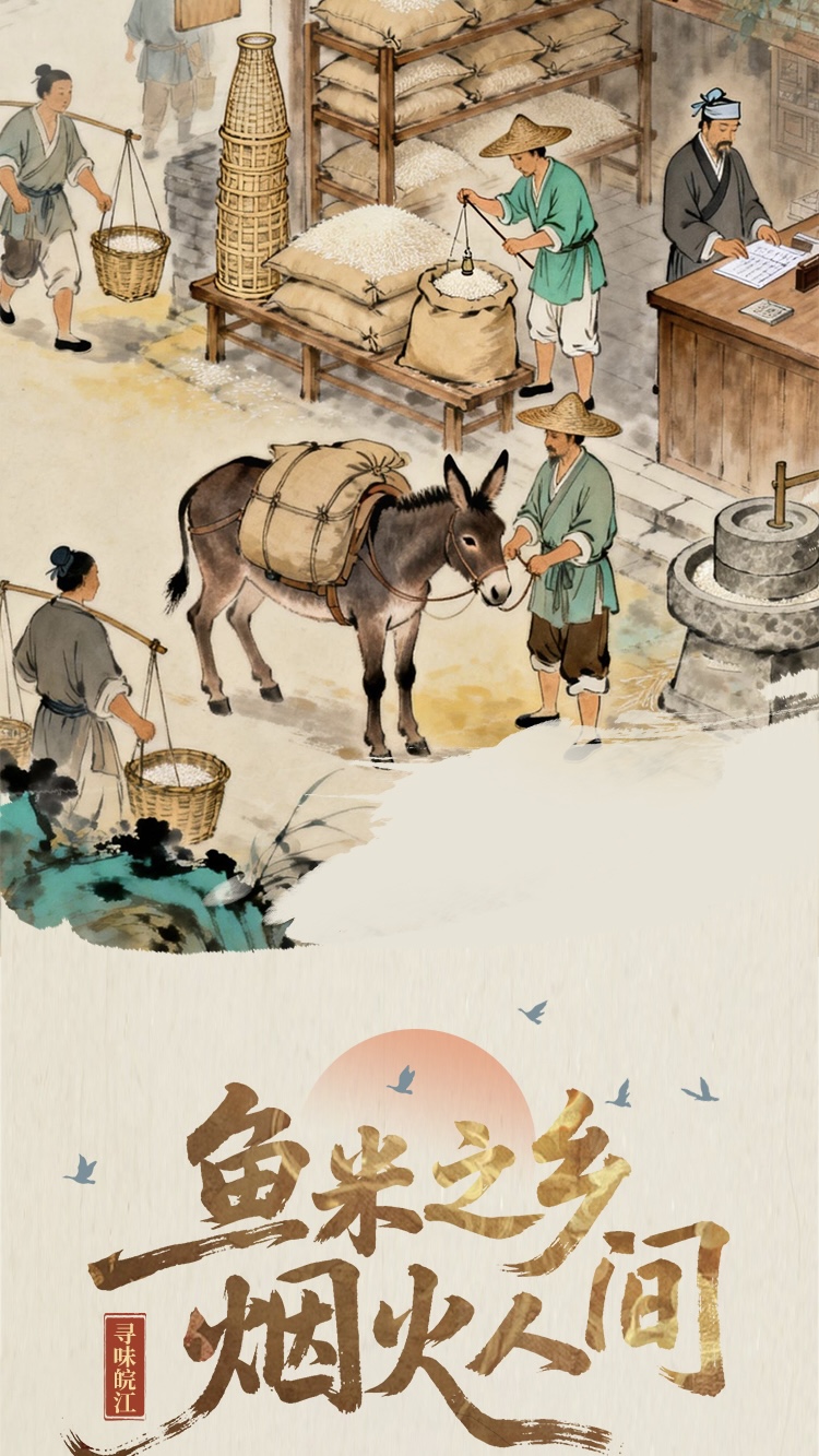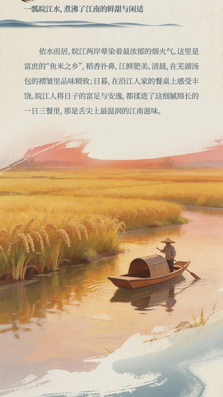 长图以滔滔江水为墨,挥洒出八百里皖江的厚重与灵动。AI视角穿透历史烟云,既在“两岸青山相对出”的奇景中捕捉李白的豪情,又在安庆江畔的机器轰鸣里铭刻近代工业的先声。这里是吴头楚尾的咽喉要地,激荡着敢为人先的进取精神;这里也是温柔富庶的鱼米之乡,流淌着精致闲适的江南生活。让我们跟随这幅数字画卷溯流而上,在芜湖米市的喧闹繁华与今日港口的开放新姿中,读懂安徽拥抱世界的胸襟与气度。