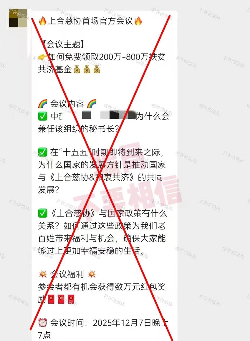 碰瓷“上合组织”,打着“上合慈协”名义,以免费领取所谓的“200-800万扶贫共济基金”为诱饵吸引参与者加入,达到诈骗目的。