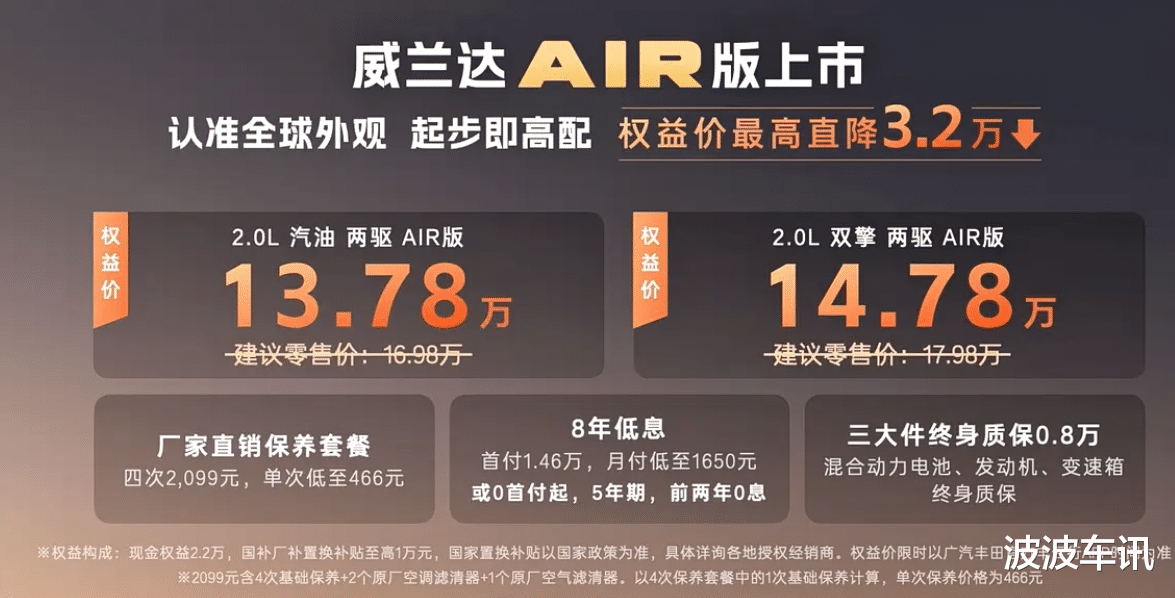 2月24日,全新广汽丰田威兰达推出了Air版,再次降低了这款车的门槛,2.0L燃油版和2.0L双擎版都有此配置,它的限时权益价仅13.78万起,在合资紧凑型SUV的阵营当中引起了巨大的反响,毕竟全新广汽丰田威兰达是刚刚换代不久的车型,所以对同级的影响力还是很大的。