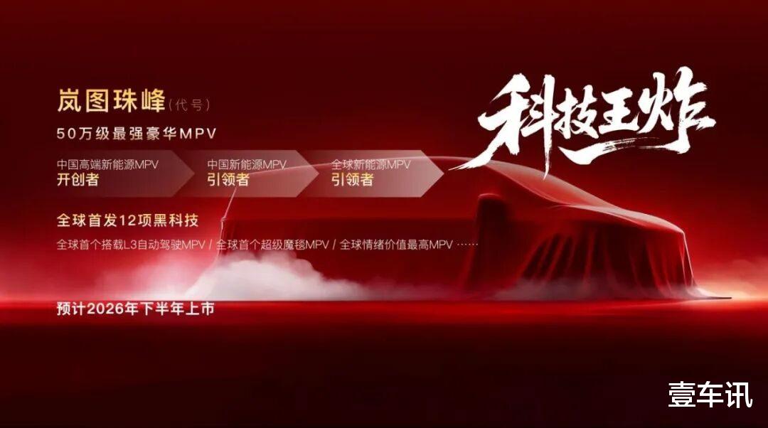 作为中国高端新能源MPV的开创者,岚图汽车始终以代代领先为标准,推出的岚图梦想家稳居高端MPV销量冠军,并在2024年、2025年蝉联MPV用户净推荐值第一。2026年,岚图汽车将完成MPV系列化布局,重磅加推一款“50万级最强豪华MPV”,代号“珠峰”,与岚图梦想家形成组合,剑指全品类MPV销冠及全球新能源MPV引领者地位。该车型将全球首发12项黑科技,是全球首搭L3级自动驾驶MPV和情绪价值最高的MPV,将实现智能化、人车交互与豪华体验的全面引领,重新定义MPV的价值天花板。该车型将于2026下半年上市,成为岚图汽车夯实MPV领导地位的核心力作。