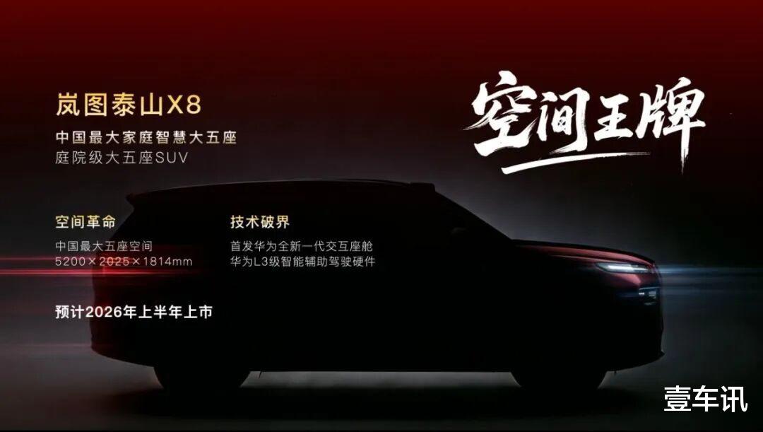 岚图全新推出的“庭院级大五座SUV”岚图泰山X8,致力于构建一个“可移动的家庭生活空间”,为中国家庭用户提供空间体验与智能出行解决方案。该车车长5200mm,宽2025mm,高1814mm,是“国内最大家庭智慧大五座SUV”,宽敞座舱设计可满足儿童自由活动、长辈舒适休憩等多元家庭出行需求,真正实现“无束缚”的全家旅程。在智能化方面,岚图泰山X8将搭载华为最新一代智能座舱系统,并配备L3级智能辅助驾驶硬件,进一步强化其在高端新能源SUV市场的核心竞争力。该车型将于2026年上半年正式上市,是岚图扩充SUV产品矩阵的重要车型。