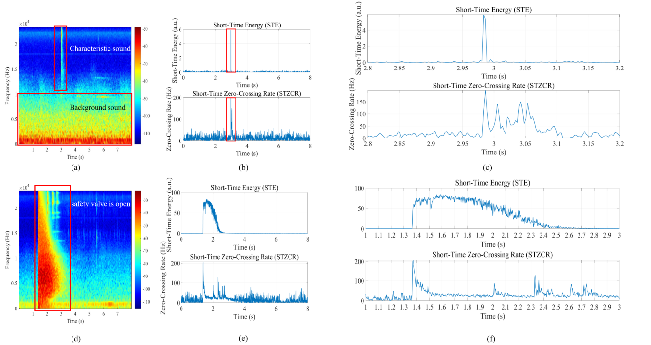 上方为热失控早期安全阀异常声音与背景噪声的时频分布,下方为热失控发生时声波信号。