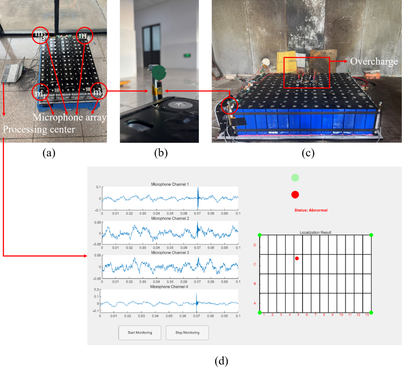 在系统设计中,研究团队构建了由四个高灵敏度麦克风组成的阵列,布置在电池包的四角。系统可捕捉到微弱高频声信号。每一路信号经过前端滤波与放大后,被输入到深度学习识别模块。算法部分采用双向门控循环单元神经网络,结合声学特征,能自动识别出热失控早期安全阀异常声音特征的声学片段。