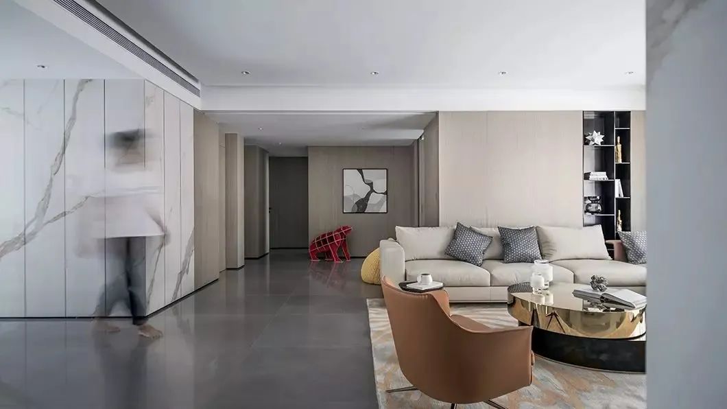 ▲客厅整体现代大方的空间基调,布置上舒适华丽的家具软装与细节装饰,在无主灯的空间氛围下,呈现出一种自然优雅的轻松与惬意感。