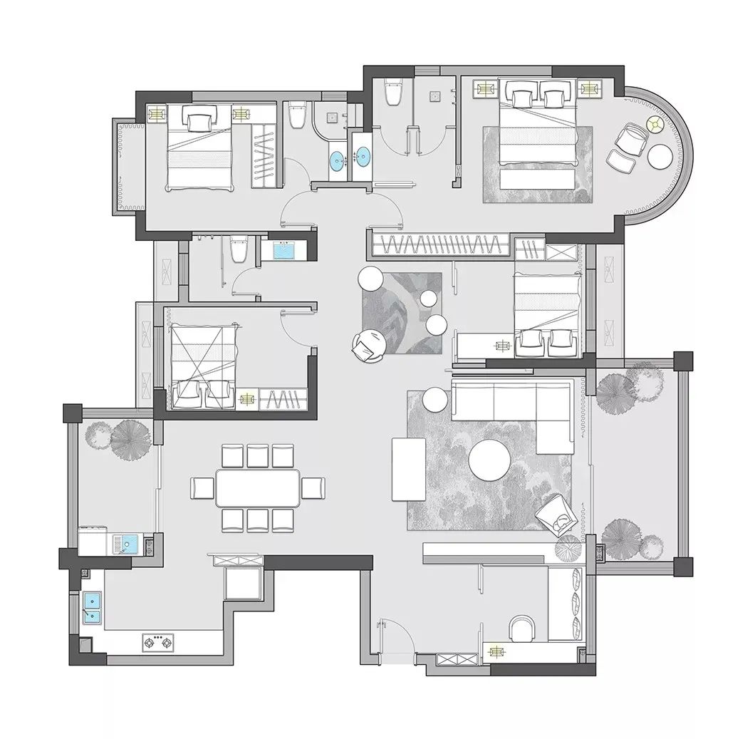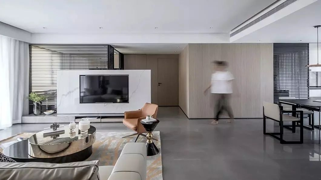 在这套160平米的现代简约风格装修案例中,整体空间以明亮大方的氛围基调,大量引入黑色百叶作为隔门设计,而在墙面装饰上也是引入大面积的木饰面,呈现出一种通透的高级气质,置身其中可以感受到一种轻松舒适的从容与惬意感。