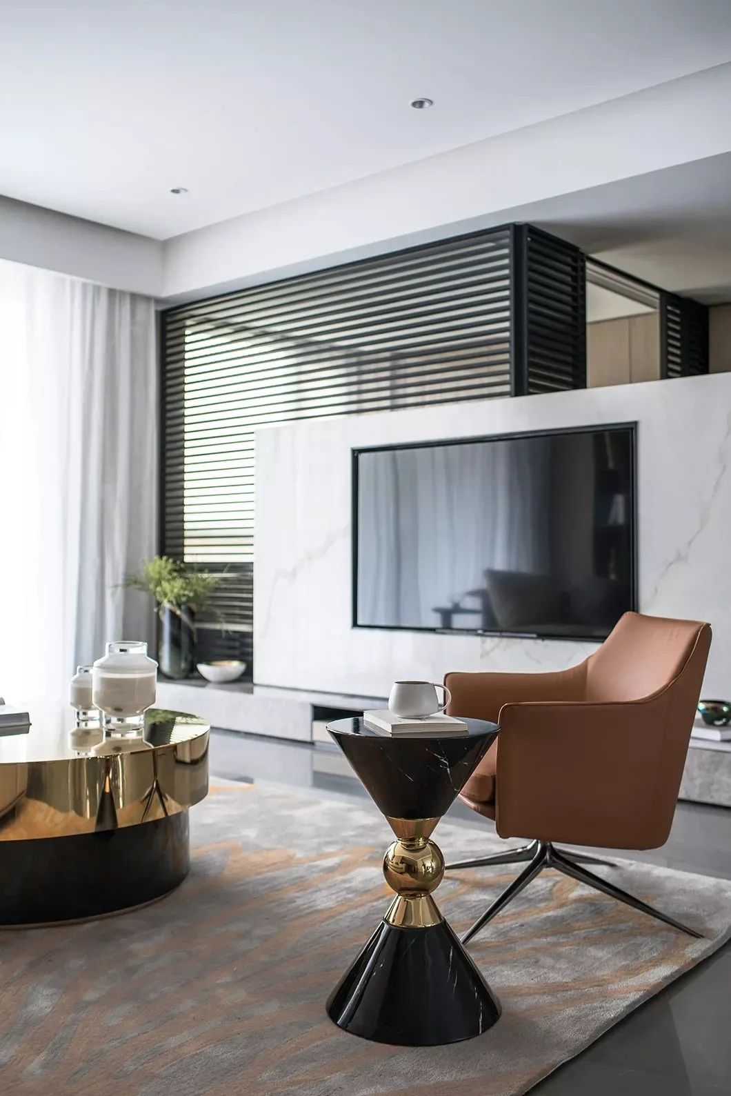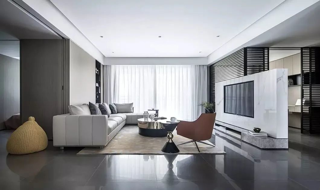▲电视墙以地台+矮墙的组合设计,后方是书房,加入玻璃隔墙与百叶帘的组合,带来一种优雅而明亮的宽敞视觉感。
