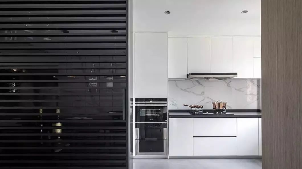 ▲餐厅与厨房之间,以百叶门共享作为酒柜与厨房的隔门,打开厨房门,百叶门就是餐厅的酒柜门;关上厨房门就露出餐厅酒柜架,灵活优雅的设计,显得更加华丽而有趣。