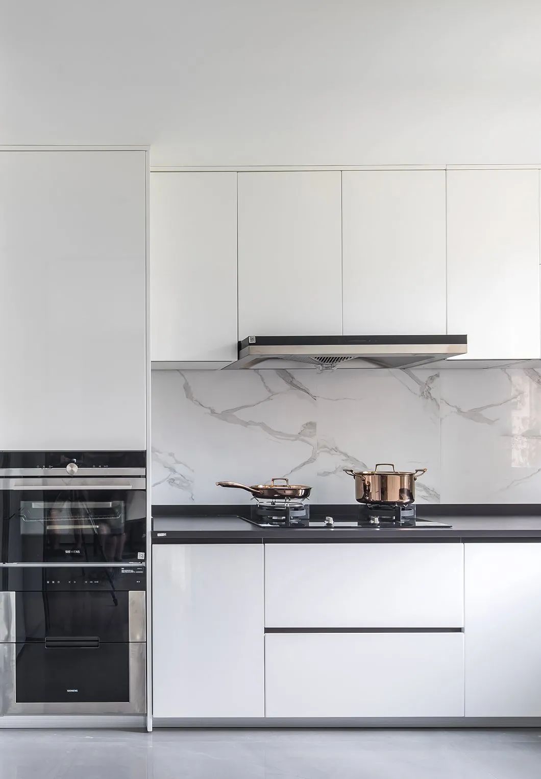 ▲厨房雅白的墙面与白色定制柜,左侧电器柜安装,保持厨房台面简洁大方,让做饭氛围更加优雅端庄。