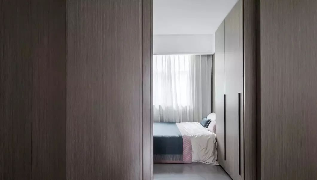 ▲次卧也是以木饰面的柜体质感,靠窗布置床铺,简雅舒适的床单布置,显得格外的简约优雅而舒适。
