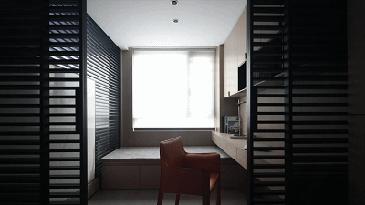 ▲玄关旁边的是书房,以百叶造型作为空间的隔断,定制上书桌+飘窗组合,还有一张棕色的椅子,提供了一个现代舒适的工作或阅读空间体验,累了也可以坐在飘窗上休闲放松。