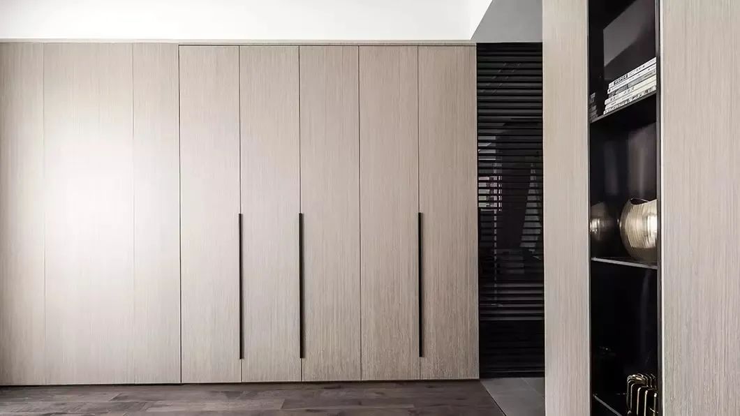 ▲浅木色的木饰面与衣柜连为一体,简洁的空间感显得更加自然大方。侧边墙上植入了一个黑色的格架,摆上装饰品与杂志,也是显得更加华丽高级