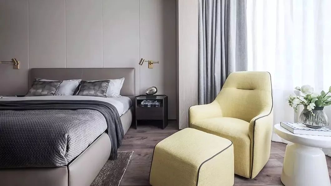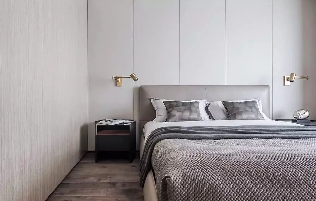 ▲在侧边墙面加入木饰面,床头墙也是灰色的硬包为背景,搭配灰色皮艺床,布置简约素雅的床单,精致成熟的床头柜摆饰,也让卧室显得更加优雅高级。