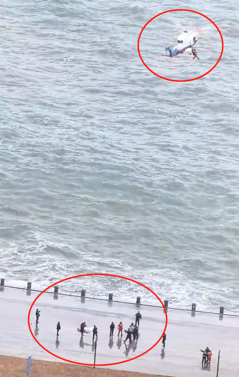 当发现有人落水之后。先是快艇抵近救援,但是能看出在风浪中,快艇没办法接近落水的人进行救助。无奈撤离。当岸上焦急的人们觉得希望渺茫的时候。天空中传来了隆隆的声音,一架直升机开了过来,悬降了一位救援者进行救援。只见他在空中不断迈动脚步,好像凌波微步一样调整方向。