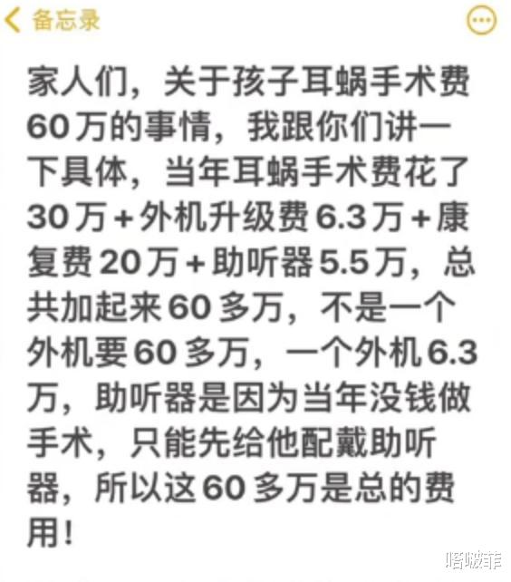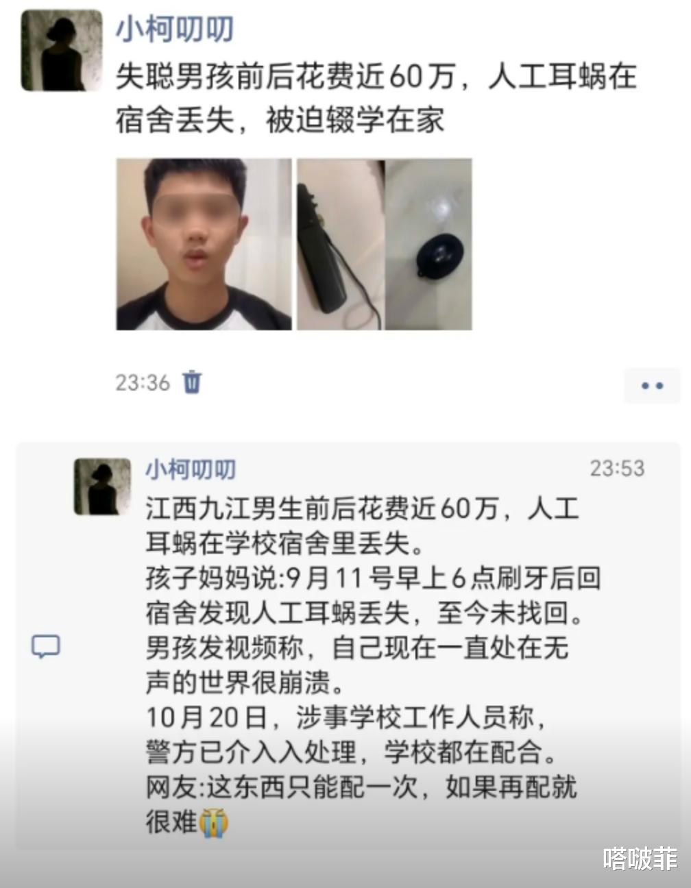 男孩的母亲也罗列出了当时帮孩子购买人工耳蜗和做手术的费用清单,一共花费了60多万,如今已经没有能力在重新帮孩子配了。这个事情一下子引起社会舆论,很多人表示应该是宿舍的其他孩子故意偷走丢掉的!