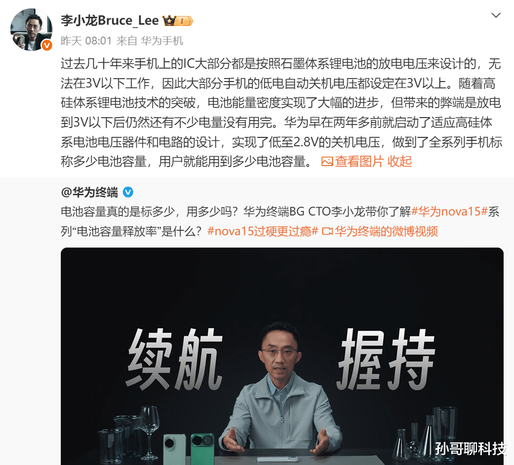 李小龙表示,将手机电压从3.0V降到2.8V需要对电源管理芯片、处理器、射频模块等核心元器件都做出优化,否则容易引发数据丢失,体验受影响。这是牵一发而动全身的系统工程,华为在几年前就已经开始相关工作,但是友商却没有这么做,所以友商还在用电池电压3.0V左右的设计。