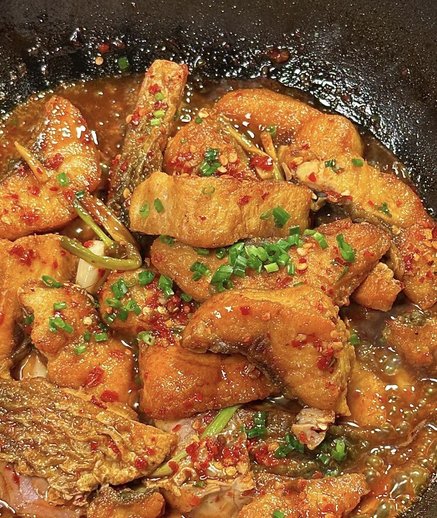 3.最后加入香醋,翻炒均匀,关火,将炒制好的香辣料汁淋在炸好的鱼块上,轻轻翻动,使每块鱼块均匀裹上料汁。