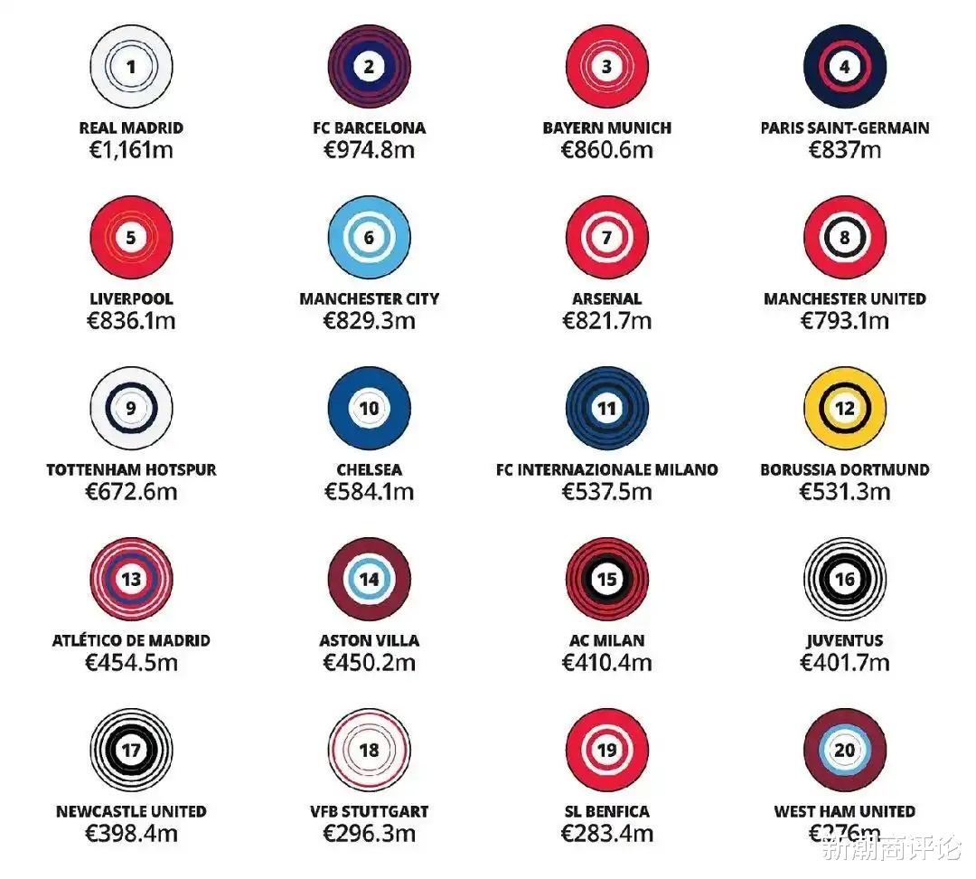 成熟多元的收入结构、全球化品牌运营、赛事IP高溢价与资本加持,叠加完善的联赛体系与商业生态,欧洲俱乐部形成了可持续的盈利循环。这一点从知名国际会计师事务所德勤发布的《德勤足坛财富榜2026》(Deloitte Football Money League 2026)能够看到,上榜的30家俱乐部全部来自欧洲。其中,英国15家,德国、意大利各有4家,西班牙3家,土耳其2家,法国、葡萄牙各有1家。