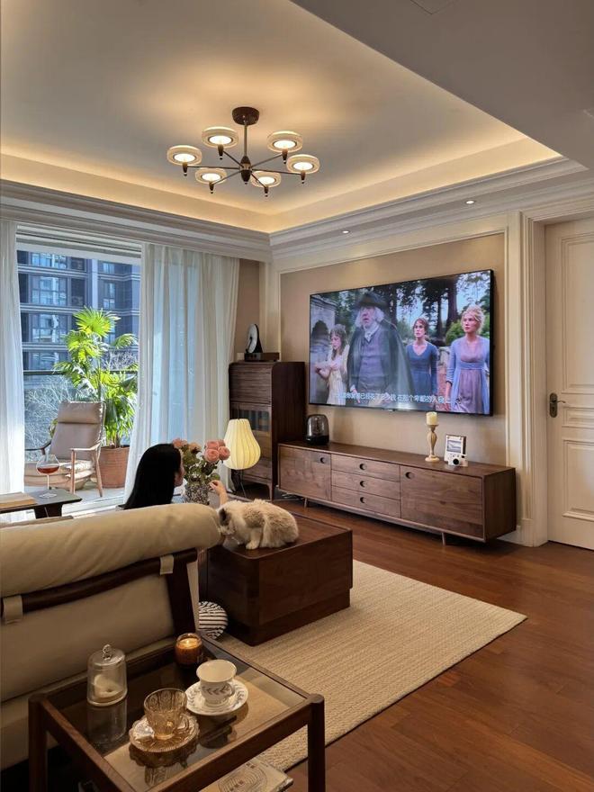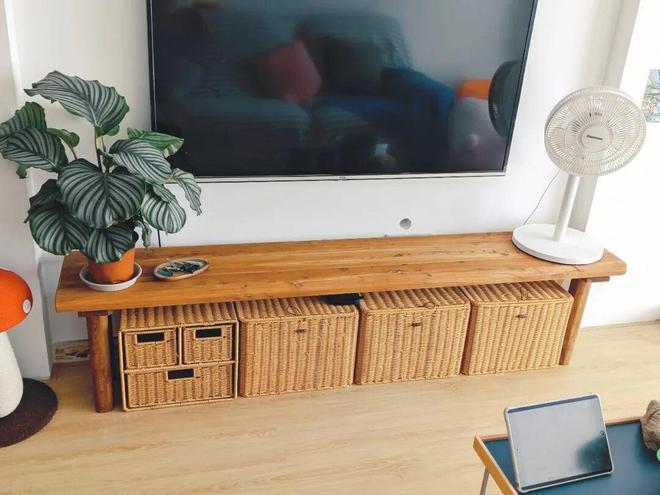 1)用「实木长凳+藤编筐」平替电视柜,成本不到一千块,颜值一点也不差,而且还保证了实用性。