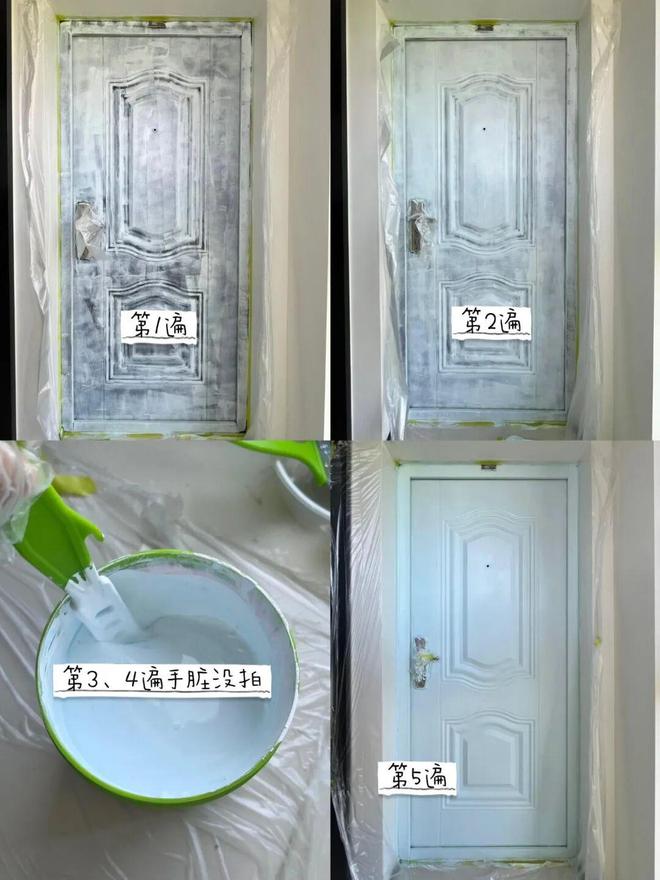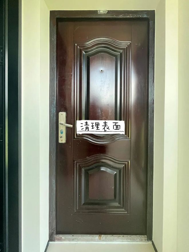 清洁打磨:先把入户门上残留的保护膜撕掉,再用清洁剂+钢丝球进行打磨清洁。