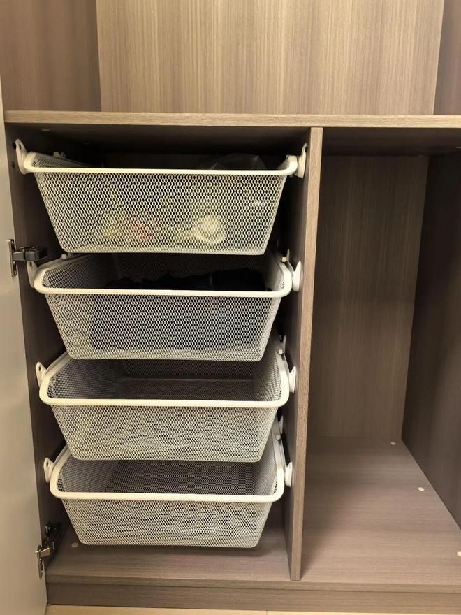 以一个60cm左右宽的拉篮筐为例,即便加上滑轨,成本也不到100块,比做定制抽屉划算多了。