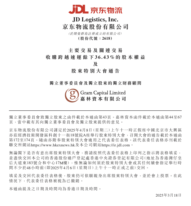 3月17日,京东物流正式发布公告,宣布已完成对跨越速运余下36.43%股本权益的收购。此次交割后,京东物流持有跨越速运100%的股权,标志着京东物流在物流行业的整合步伐进一步加快。
