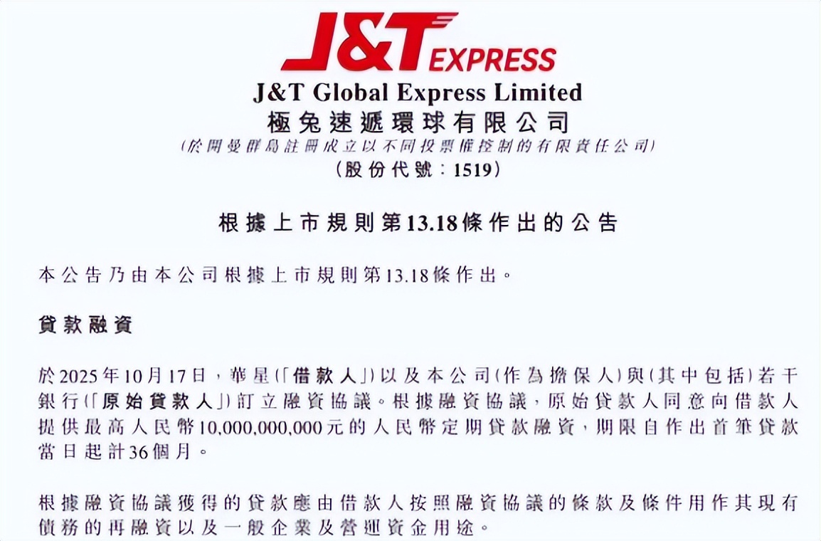 10月17日,极兔速递(股票代码:01519.HK)宣布其全资附属公司华星集团作为借款人,与公司及若干银行签署融资协议,获得最高100亿元人民币的定期贷款融资,贷款期限为36个月。