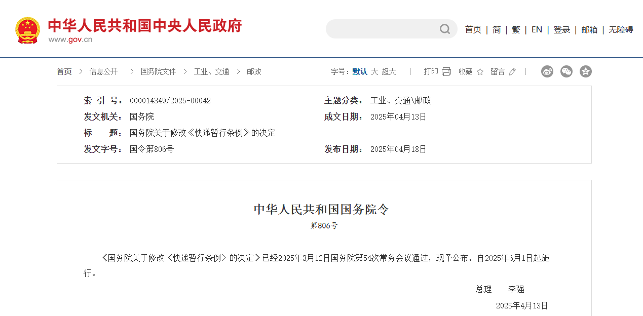 据悉,国务院总理李强签署国务院令,公布《国务院关于修改〈快递暂行条例〉的决定》,自2025年6月1日起施行。