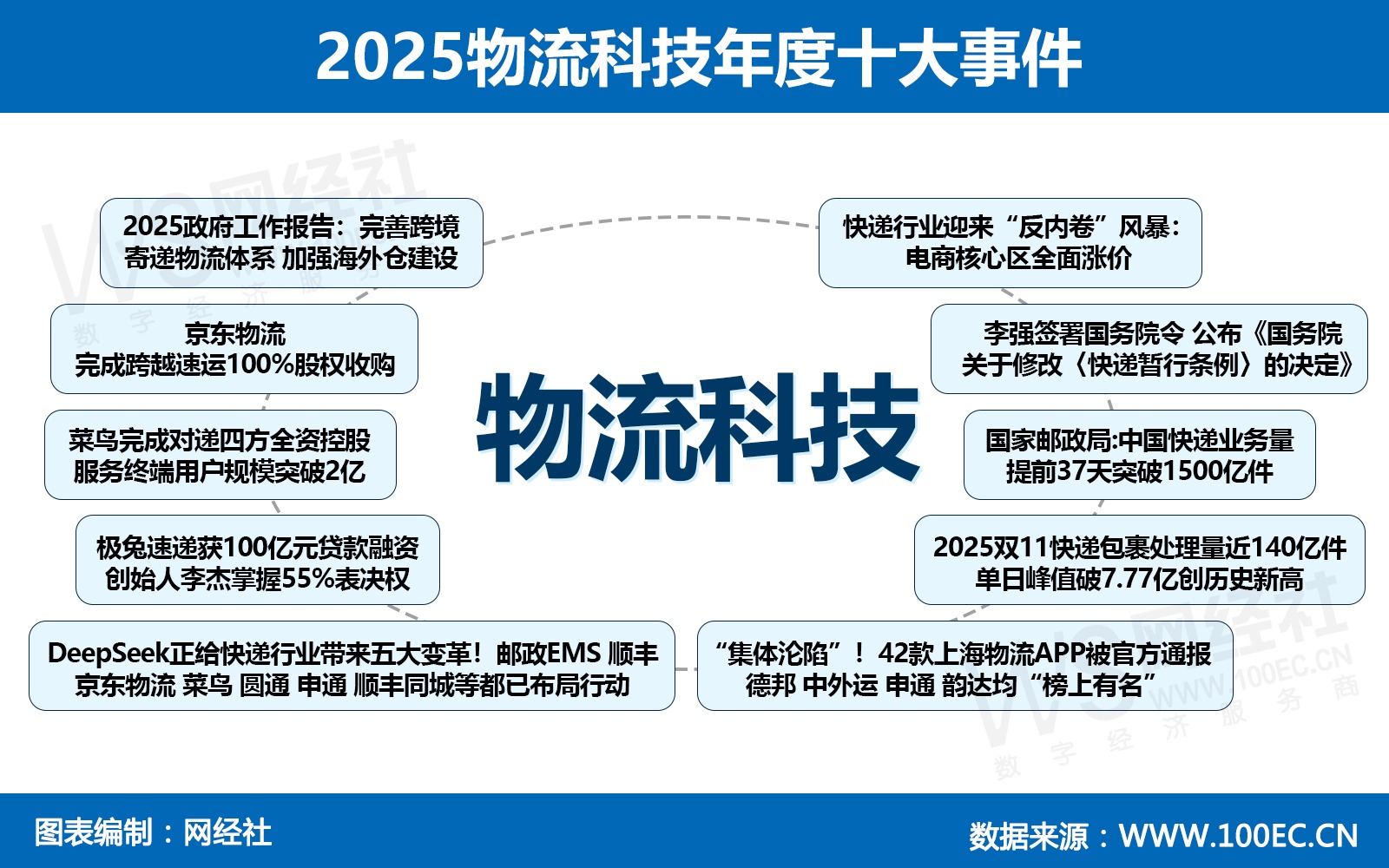 2025年,中国物流行业在政策与市场的双轮驱动下迈向高质量发展。行业内部则呈现深度整合(京东物流、菜鸟收购)、技术赋能(AI大模型变革)与资本助力(极兔融资)并举的格局。市场竞争焦点从“价格战”转向“价值战”,电商核心区普遍涨价,同时数据合规监管趋严。对此,网经社物流科技台对2025年物流科技十大事件进行盘点回顾。