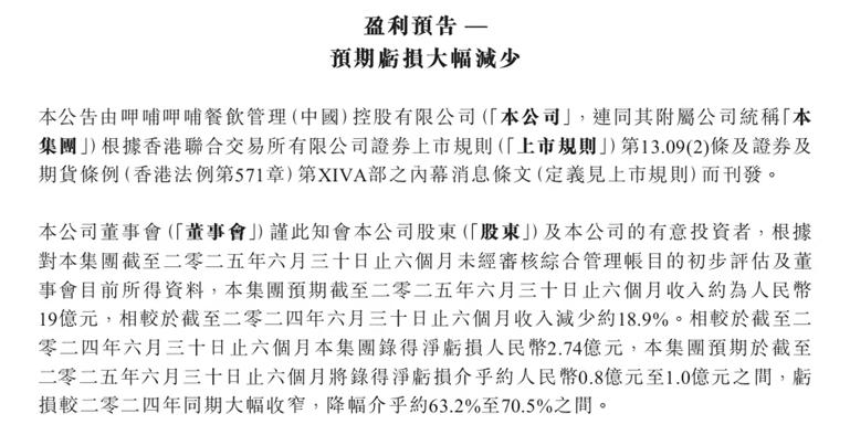 根据财报数据,2025年上半年,呷哺集团的营收是19.4亿,净亏损是0.8亿。从2021年至2025年这五年,累计亏损金额已达到13亿。