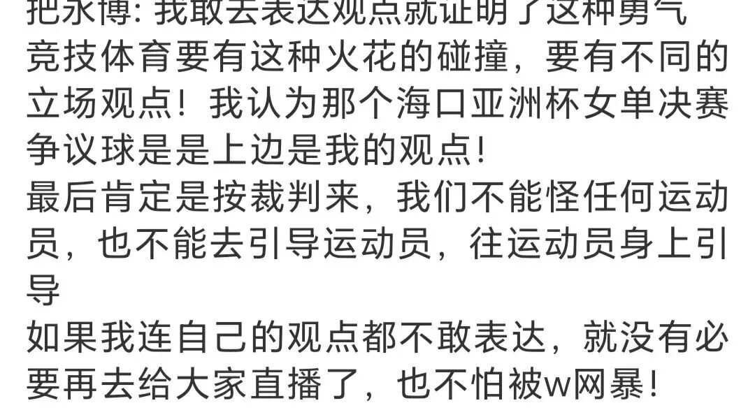 但在表达观点的同时,他也告诉大家要支持裁判,不能怪任何运动员,也不能做刻意引导。