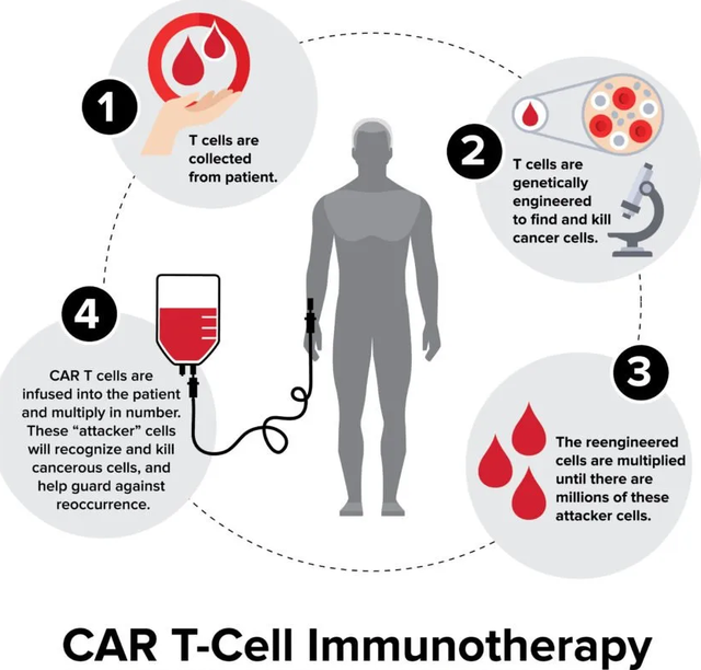 该技术在采集患者的T细胞后,将其送至实验室,通过基因改造之后使其表达嵌合抗原受体(CAR),该受体能引导T细胞精准识别癌细胞(及部分正常细胞)表面的特定抗原蛋白,同时增强T细胞杀伤癌细胞的能力。CAR-T细胞经过培养扩增达到一定数量后再回输给患者,进入体内后,这些CAR-T细胞便会清晰地识别出癌细胞与正常细胞的不同,随后便能精准的杀死癌细胞。