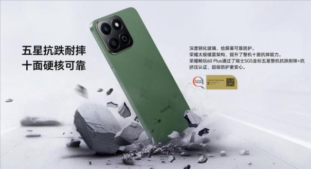 荣耀畅玩60Plus具有五星超抗摔的特性,通过了瑞士SGS金标五星抗跌耐摔认证,让你在使用过程中更加安心。IP64级防尘防水功能,让你无惧日常溅水和雨淋。加之其精细的做工与高品质的材料选择,更是让这款手机在外观与质感上同样出色,成为用户手中一道亮丽的风景线。