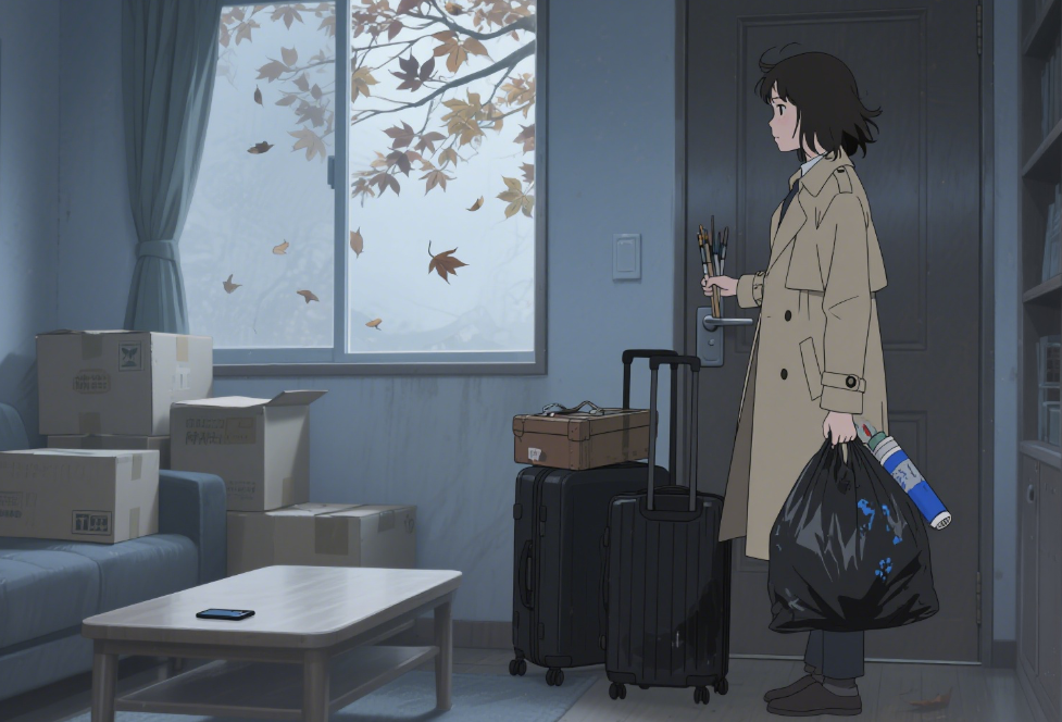 那些一起买的廉价情侣杯,印着可笑图案的围裙,打折时囤的情侣装……曾经承载着甜蜜或温馨的小物件,此刻都成了尴尬的垃圾,被毫不犹豫地扔进黑色的大塑料袋。收拾画稿和颜料箱时,看到了那管被污染的钴蓝。它静静地躺在箱底,刺目的杂色凝固在管口。我拿起来,看了几秒,然后把它也扔进了垃圾袋。连同那些被污染的、不堪回首的记忆。当最后一只行李箱的拉链合上,发出“嗤啦”一声轻响,宣告着某种终结。我看着这个生活了五年、此刻却无比陌生的房间,心里没有不舍,只有一种尘埃落定的平静和即将解脱的轻松。拖着两个巨大的行李箱和一个塞得满满的画具箱,我打开卧室门。客厅里空无一人。书房的门紧闭着。也好。我最后看了一眼这个承载了五年欢笑与泪水、最终被一场“清算”彻底埋葬的地方,拉着行李,头也不回地走了出去。楼道里感应灯应声而亮,脚步声在空旷的楼梯间回荡。身后那扇门,始终没有打开。城市深秋的风,带着凛冽的寒意扑面而来。我站在路边,看着车水马龙,深深吸了一口气。冰冷的空气涌入肺腑,带着一种刺痛感,却也带来了前所未有的清醒。结束了。新的一切,无论好坏,都将开始。